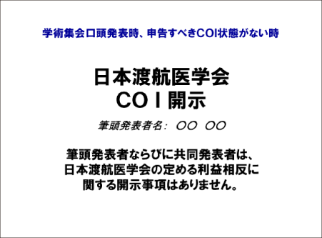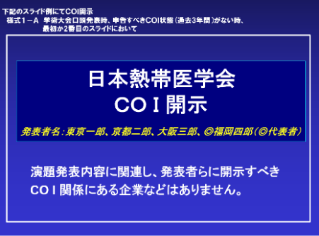 スライド1枚目に利益相反(COI)状態を記載し必ず開示してください。スライドサンプルは、下記日本熱帯医学会よりダウンロード可能です。